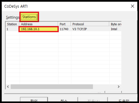 [Stations] 항목을 클릭하여, Codesys 컨트롤러의 IP 주소를 입력합니다.