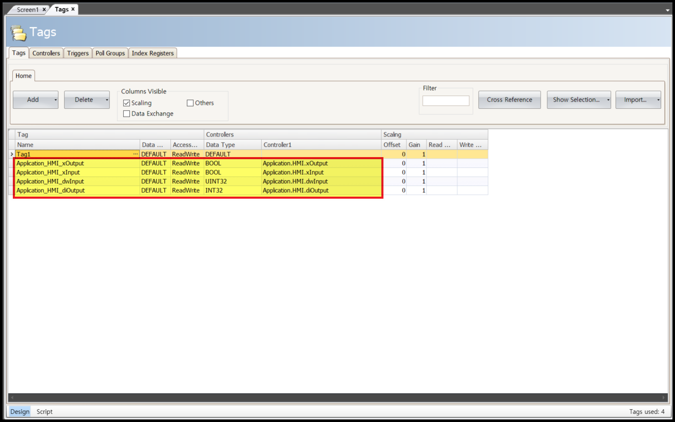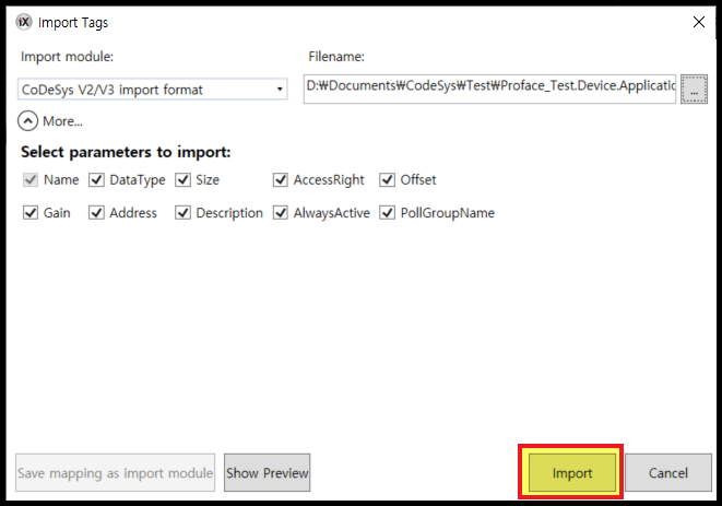 [Tag] 항목에서 [Import] 버튼 옆의 화살표를 클릭하여 [Import tags to [Controller1]...] 을 선택합니다.