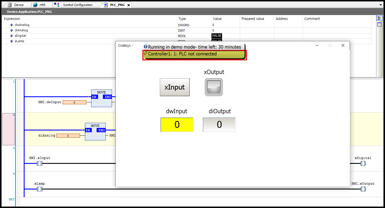 만약 Codesys 설정이 잘못 되었다면, 위와 같이 "PLC not connected" 라는 메시지가 나타납니다.