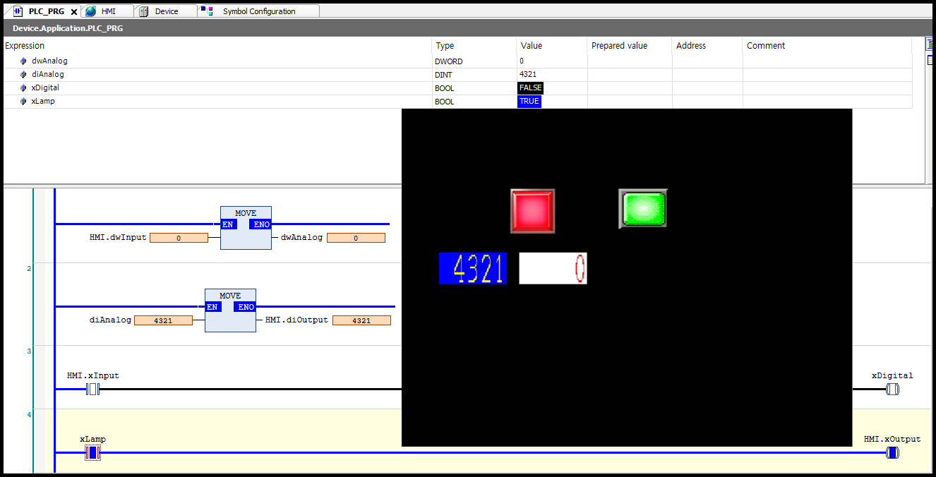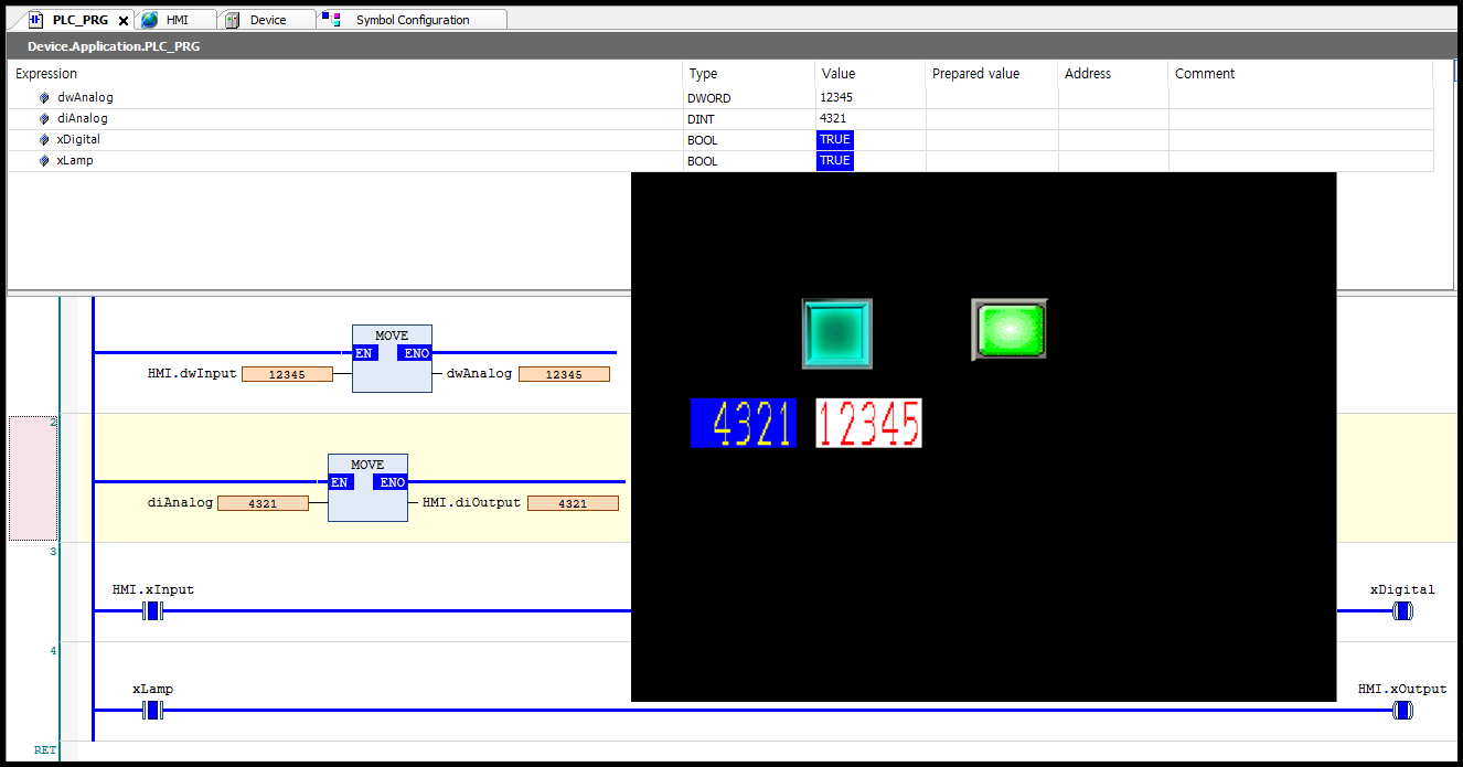 Codesys에서 변경한 값이 HMI에 적용되어 녹색 램프가 켜지고, 숫자 표시가 변경되는 것을 확인하였습니다.