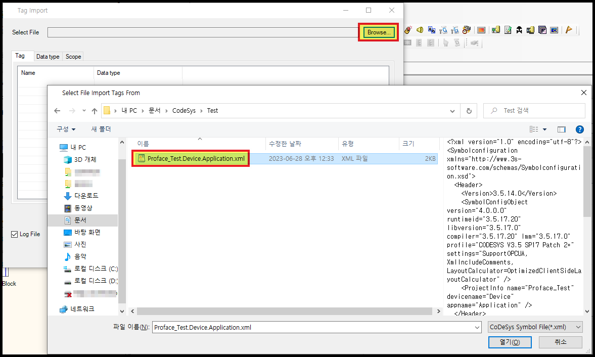 Codesys에서 생성한 "xml" 파일을 찾아서 [열기] 를 클릭합니다.