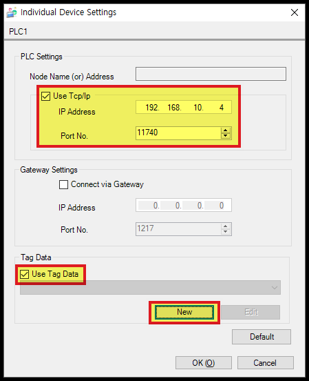 Codesys 컨트롤러의 IP 주소를 설정합니다. Port No. 항목은 그대로 "11740"으로 놔둡니다.