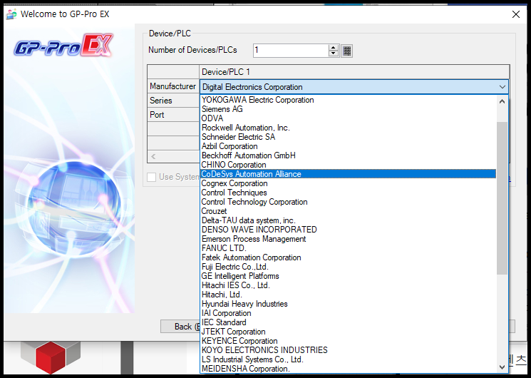 PLC 제조사 선택목록에서 "CoDeSys Automation Alliance" 를 선택합니다.