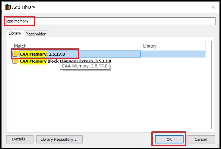 'CAA Memory" Library를 검색하고, 이를 선택한 후에 [OK] 를 클릭합니다.