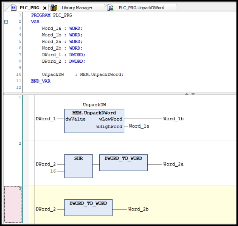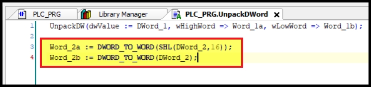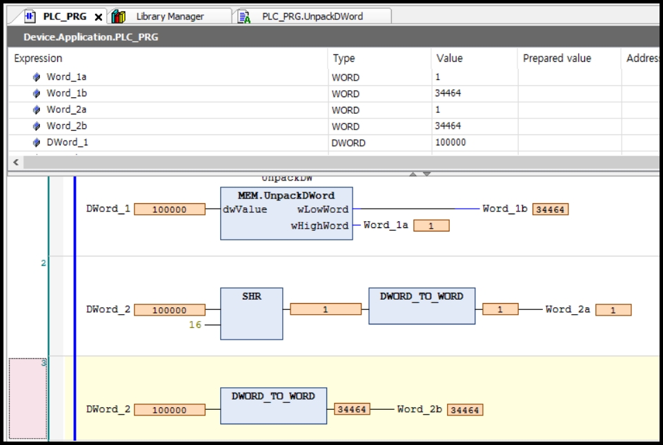 Codesys에서 하나의 DoubleWord를 두 개의 Word로 분리하는 방법입니다.