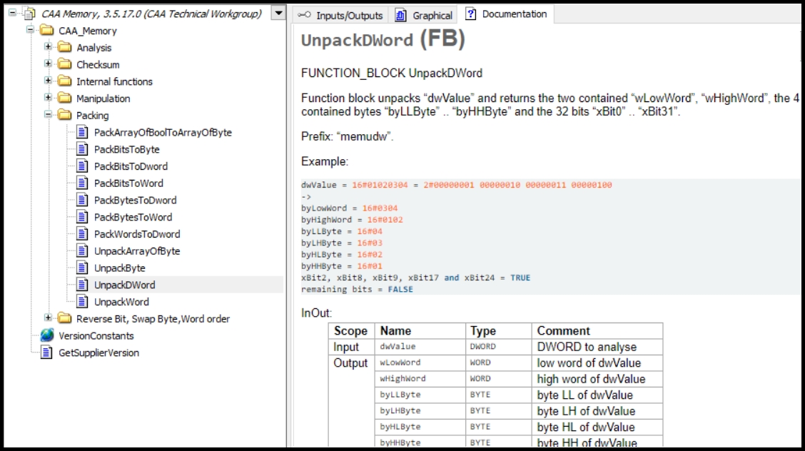 Codesys에서 제공하는 펑션블록 중에 데이터를 분리하는 "Unpack" 펑션블록이 있습니다.
