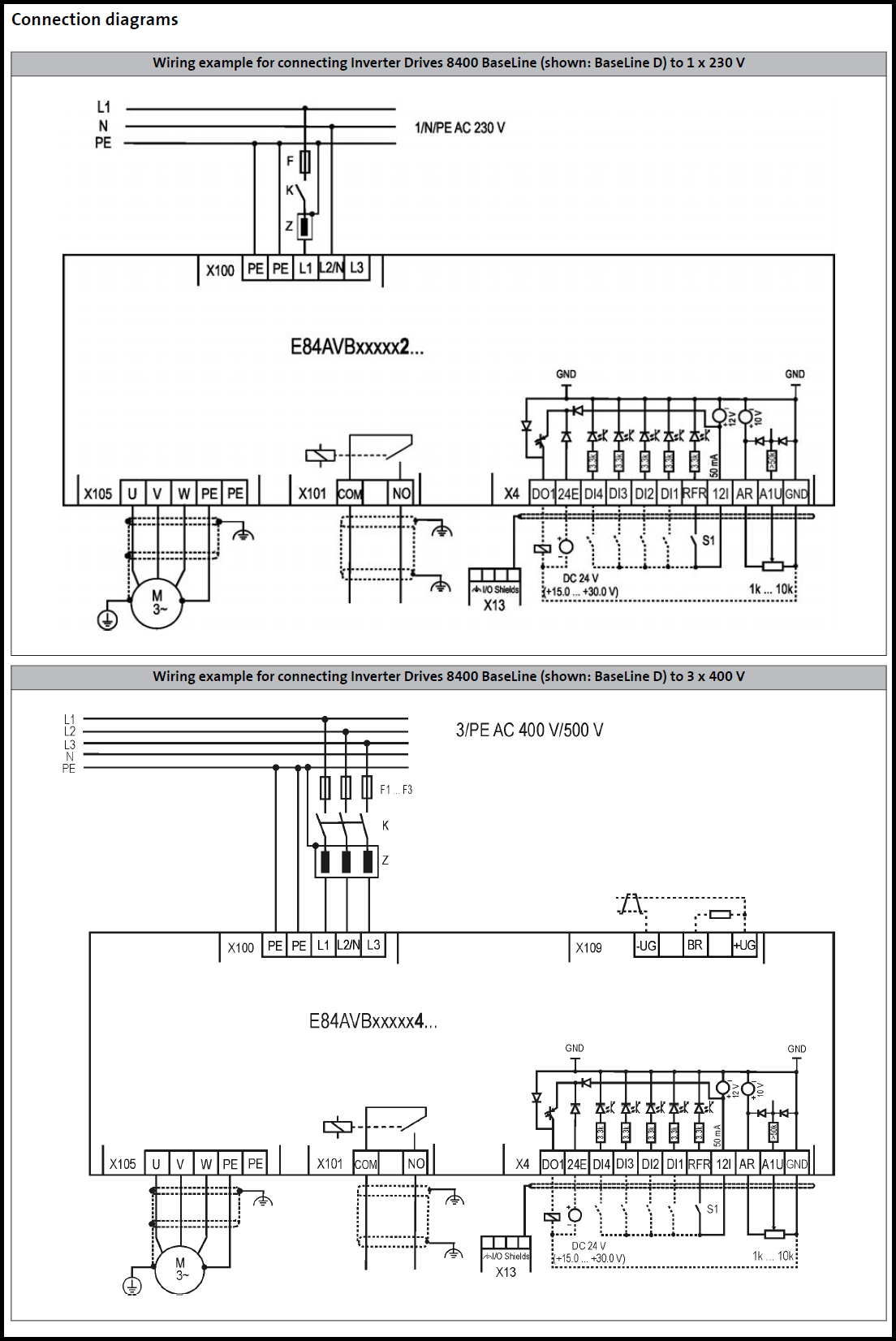 Lenze 8400 BaseLine 기본 결선도 자료입니다. 230 V 제품과 400 V 제품에 대한 자료입니다.