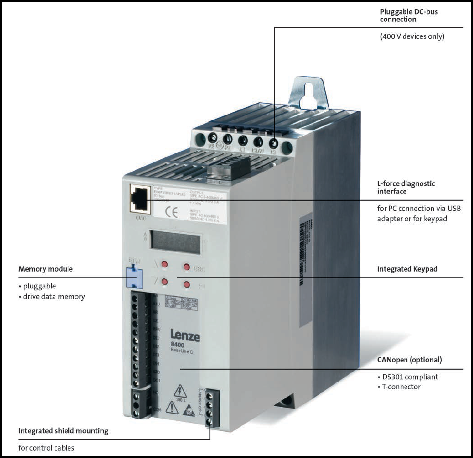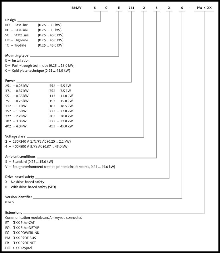 Lenze 8400 BaseLine은 모델명 E84AVBD 또는 E84AVBC 로 시작하는 제품입니다.