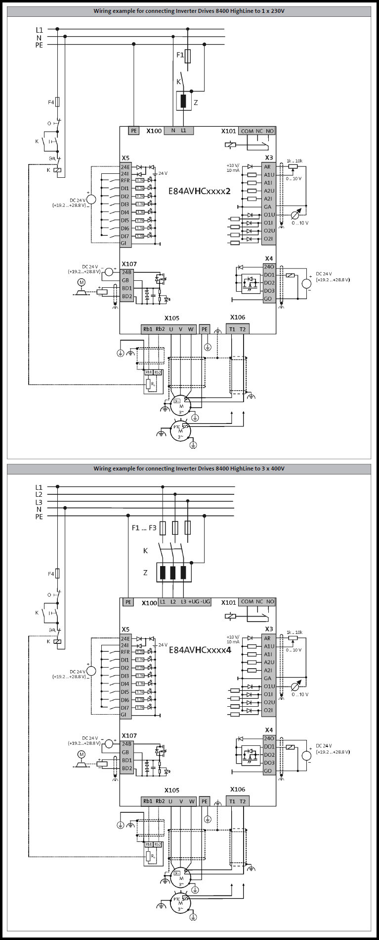 Lenze 8400 HighLine 기본 결선도 자료입니다. 230 V 제품과 400 V 제품에 대한 자료입니다.