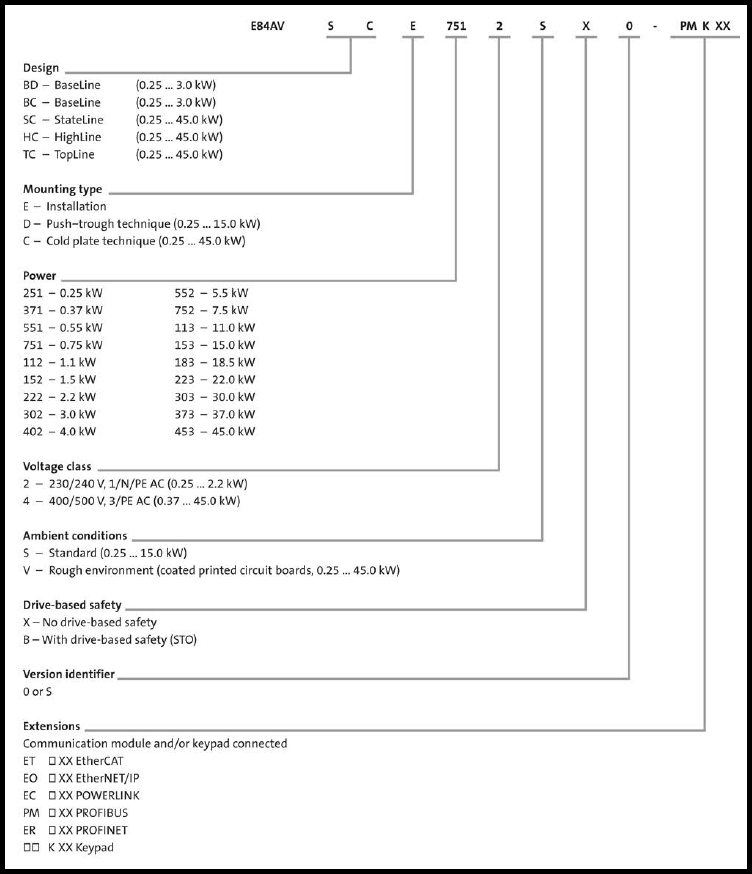 삼상 400 V 제품은 0.37 kW에서 55 kW 까지 있습니다. (E84AVHCE3714SX0 ~ E84AVHCE4534SX0)