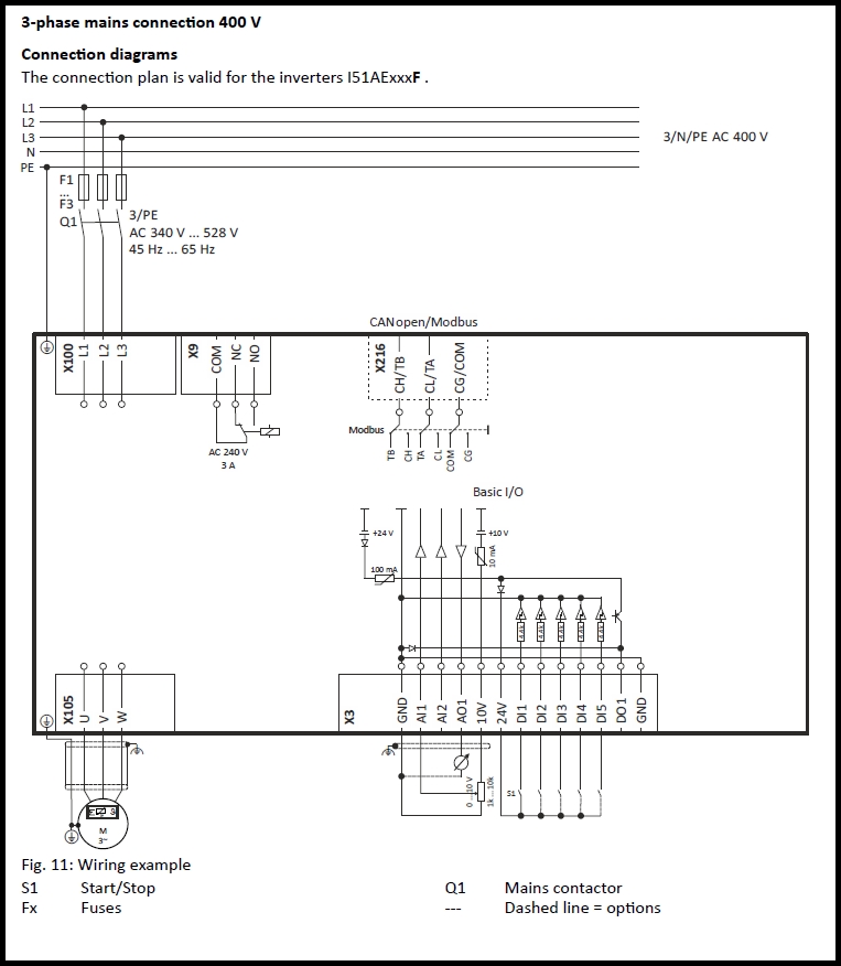 Lenze i510 시리즈 400 V 용 제품의 결선도 입니다.